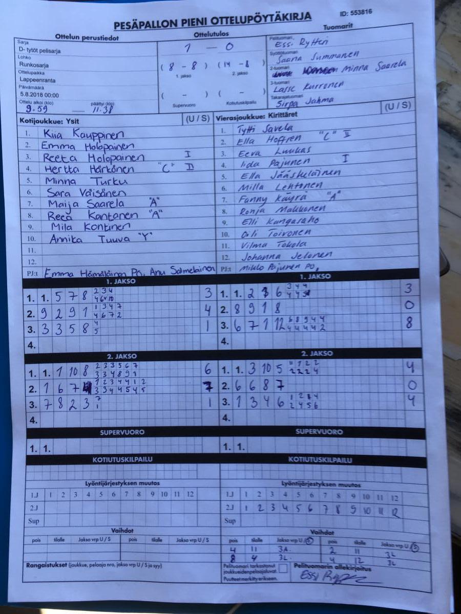 | 5.8.2018 00:02 | D- tytöt pelisarja | Runkosarja | Ysit | PuPe | 2-0 (25-4, 13-4) | | näytä |