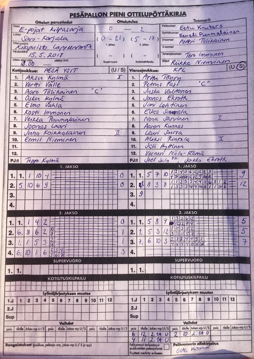 | 15.5.2018 00:00 | E- pojat kilpasarja | Runkosarja | Ysit | KPL | 0-2 (0-21, 5-17) | | näytä |