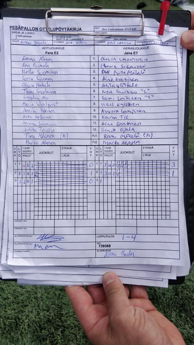 | 2.7.2019 14:00 | E-tytöt pelisarja | F | Fera E2 | Jana ET | 1-4 | APV E-tytöt | näytä |