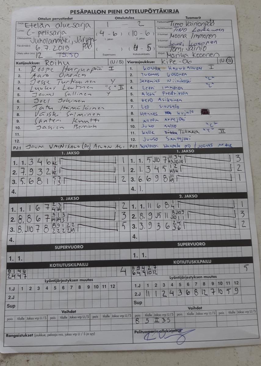 | 6.7.2019 15:00 | C- pojat pelisarja | Runkosarja | Roihu | HuVe | 2-0 (6-2, 18-7) | | |