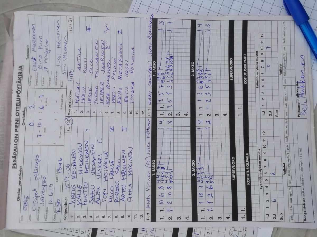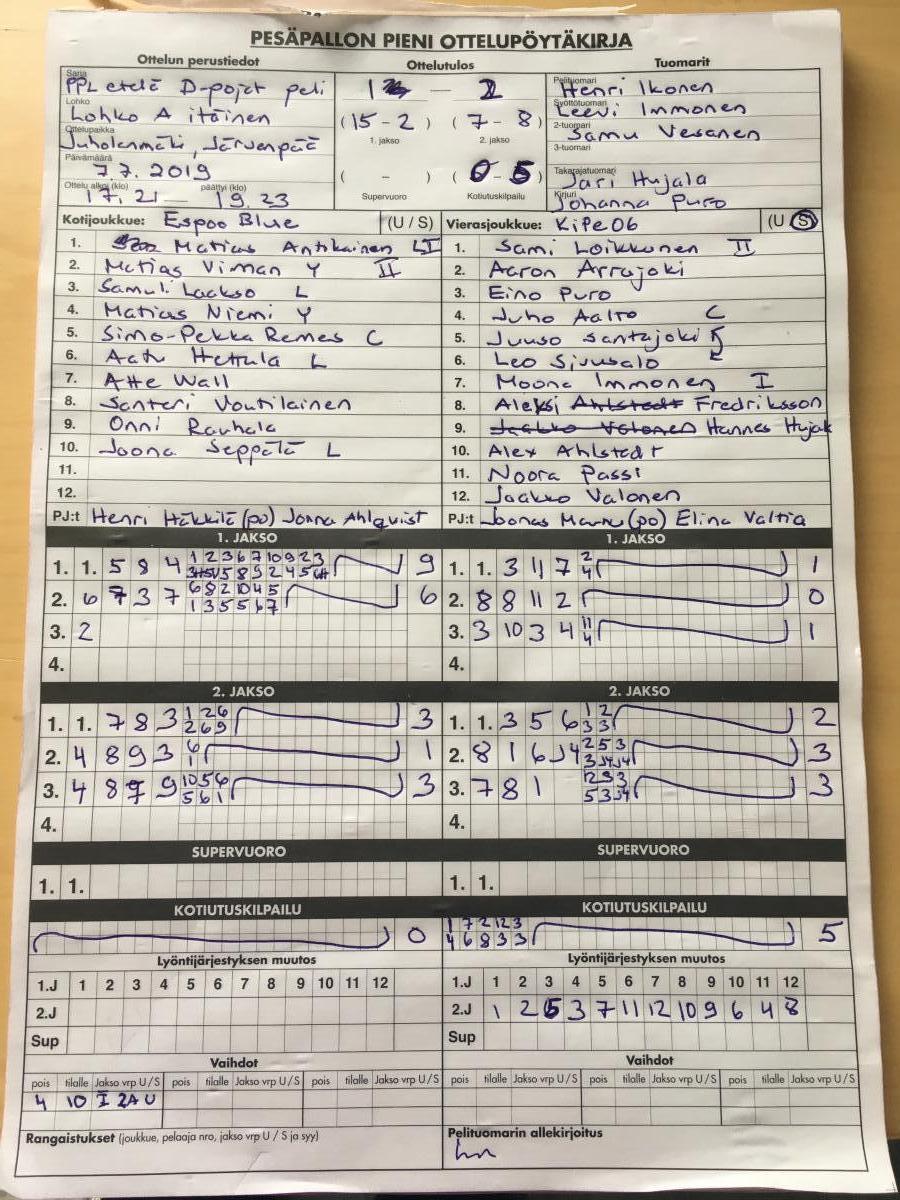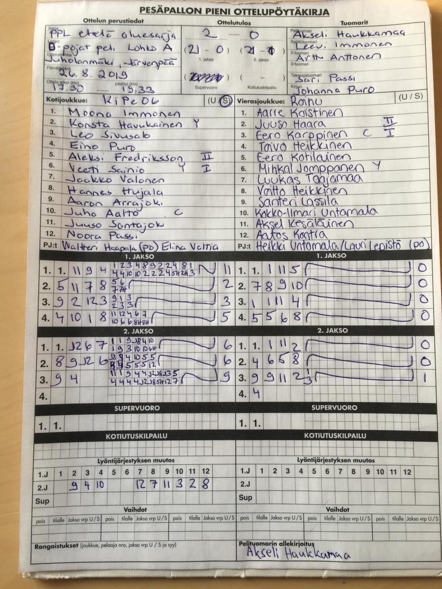 | 11.8.2019 12:00 | F- pojat | Lohko B (itäinen) | Kipe -06 F-pojat | Espoon Pesis FP | 0-1 (8-8, 7-7, 2-3) | | näytä |
