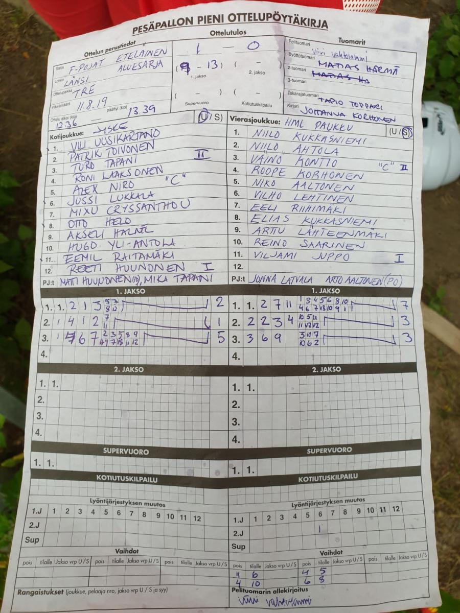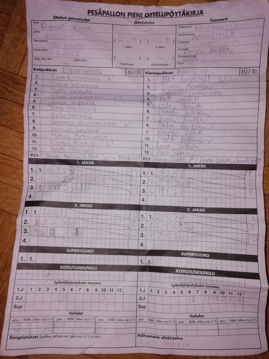 | 17.8.2019 01:00 | E- pojat kilpasarja | Runkosarja | Tahko E- Pojat | Hml Paukku E-p | 0-2 (4-8, 4-8) | | |
