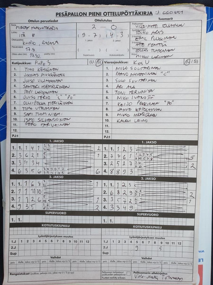| 8.7.2019 18:00 | Miesten maakuntasarja - itälohko | Lohko B | PuPe 3 | PK-P | 2-0 (9-4, 14-6) | | näytä |