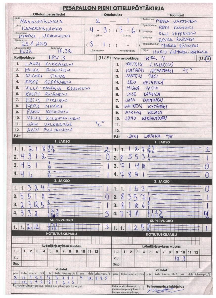 | 17.8.2019 15:00 | Miesten kaakkoislohko | Runkosarja | IPV 3 | SuPo | 2-0 (9-6, 8-6) | näytä | |