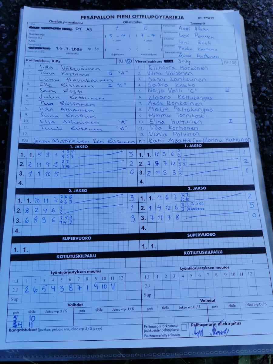 | 26.7.2020 00:00 | D-tytöt kilpasarja | Runkosarja | KiPa | SoJy | 1-0 (5-4, 7-7) | | näytä |