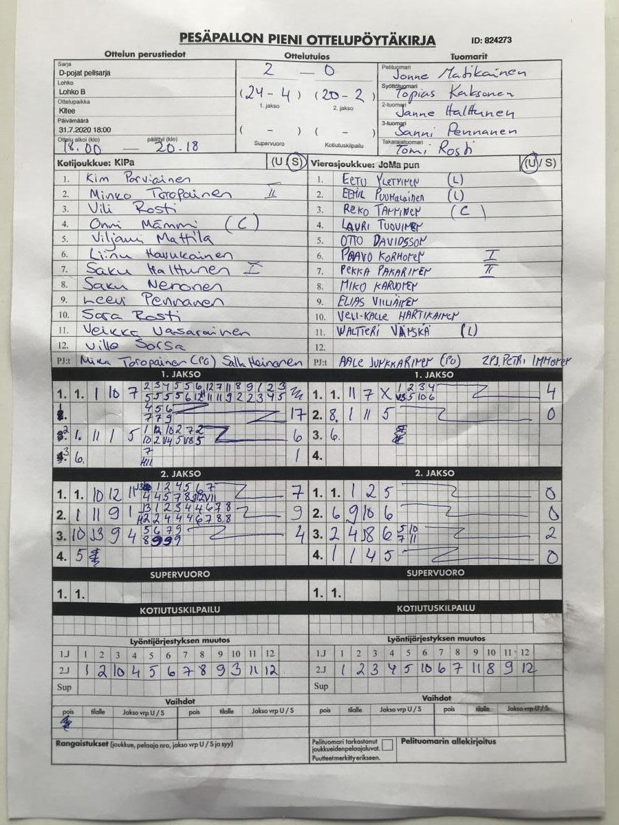 | 14.7.2020 18:00 | D-tytöt pelisarja | Runkosarja | JoMa punainen | KiPa | 1-2 (11-5, 8-9, 2-2, 4-5) | | näytä |