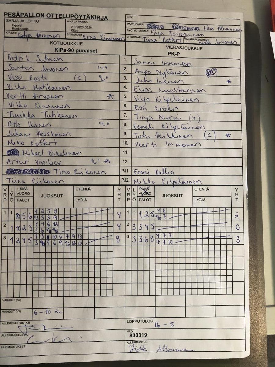 | 2.8.2020 00:04 | F-pojat | Runkosarja | KiPa-90 punaiset | PK-P | 16-5 | | näytä |