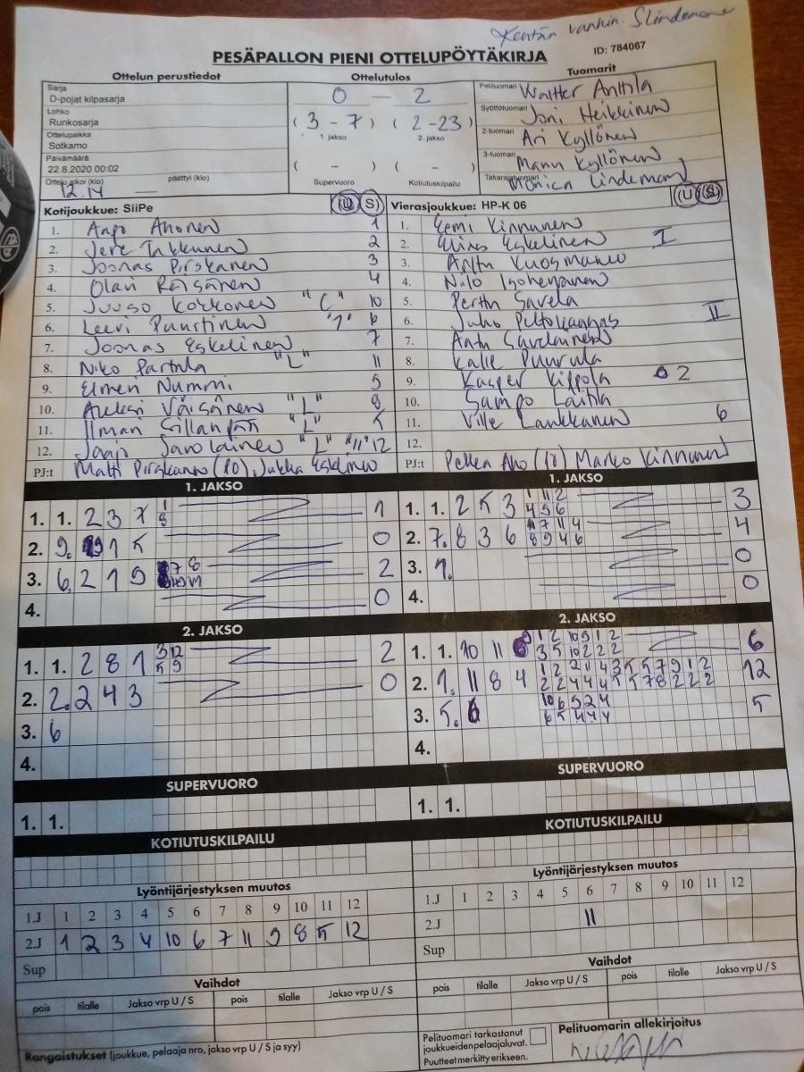| 22.8.2020 00:02 | D-pojat kilpasarja | Runkosarja | SiiPe | HP-K 06 | 0-2 (3-7, 2-23) | | näytä |