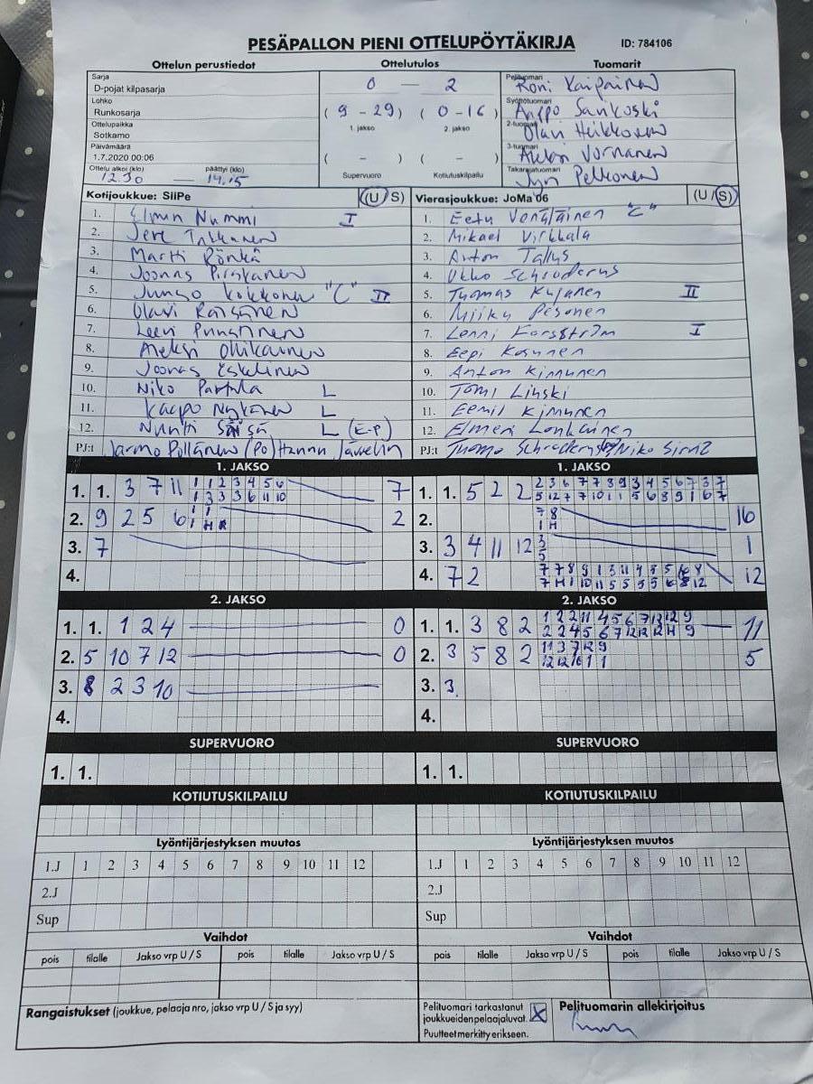 | 1.7.2020 00:06 | D-pojat kilpasarja | Runkosarja | SiiPe | JoMa 06 | 0-2 (9-29, 0-16) | | näytä |