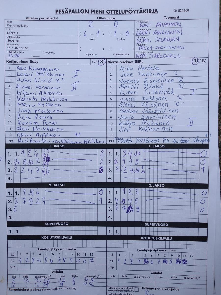 | 11.7.2020 00:00 | D-pojat pelisarja | Lohko B | SoJy | SiiPe | 2-0 (6-1, 1-0) | | näytä |