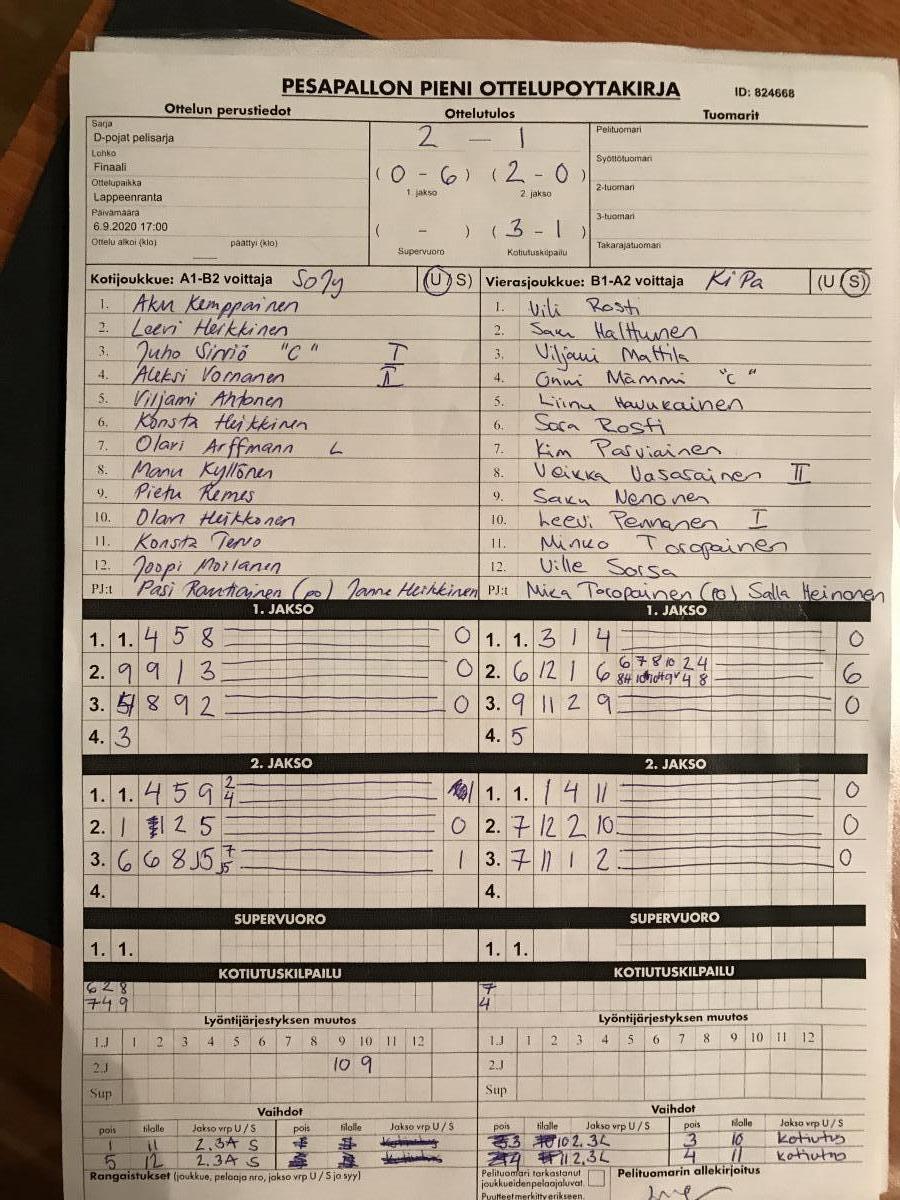 | 6.9.2020 17:00 | D-pojat pelisarja | Finaali | SoJy | KiPa | 2-1 (0-6, 2-0, 0-0, 3-1) | | näytä |