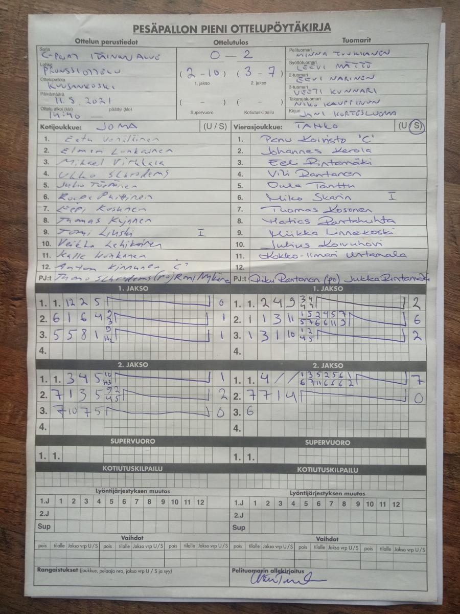 | 11.9.2021 14:00 | C-pojat | Pronssiottelu | JoMa | Tahko Yellow | 0-2 (2-10, 3-7) | näytä | |