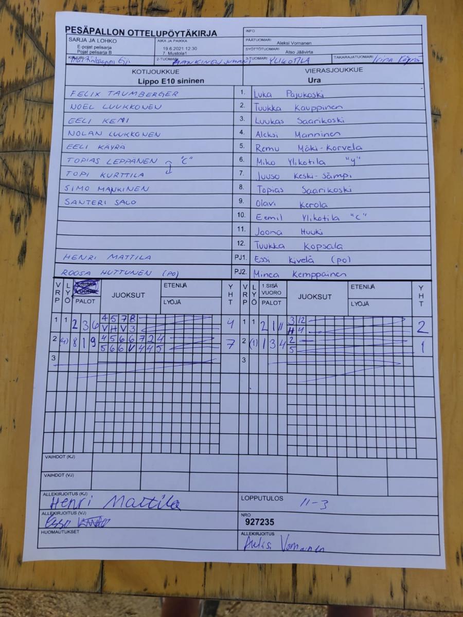 | 19.6.2021 12:30 | E-pojat pelisarja | Pojat pelisarja B | Lippo E10 sininen | Ura | 11-3 | näytä | |