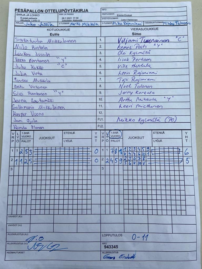 | 28.7.2021 17:30 | E-pojat pelisarja | Alkusarja, Lohko D | EuVe | Simo | 0-11 | | näytä |