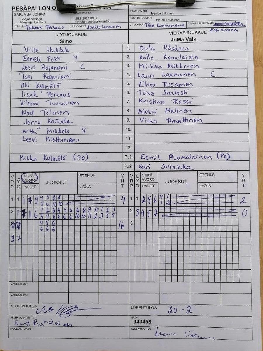 | 28.7.2021 09:30 | E-pojat pelisarja | Alkusarja, Lohko D | Simo | JoMa Valk | 20-2 | | näytä |