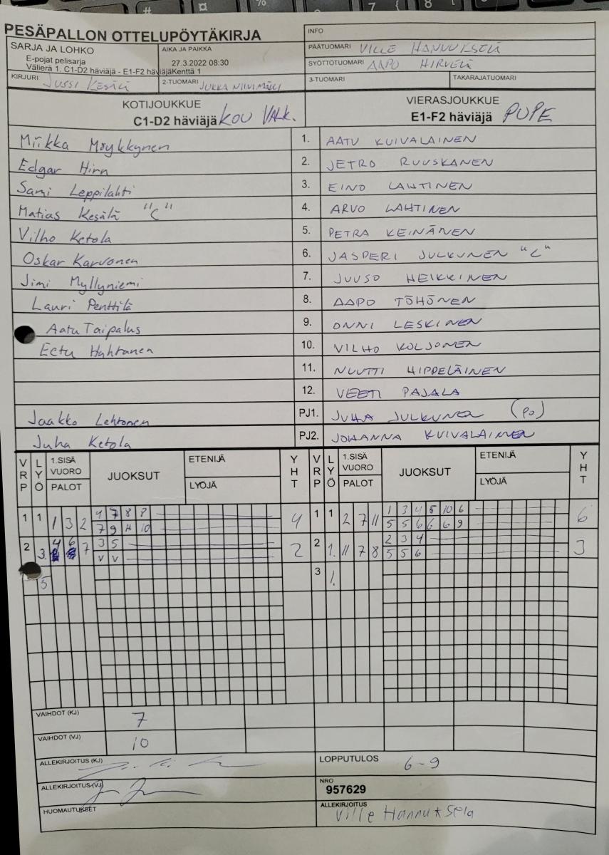 | 27.3.2022 08:30 | E-pojat pelisarja | Välierä 1. C1-D2 häviäjä - E1-F2 häviäjä | KoU valkoinen | PuPe | 6-9 | | näytä |