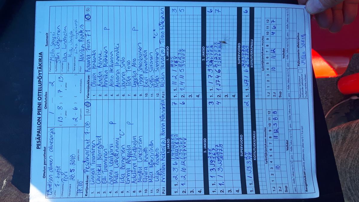 | 542704 | 23.5.2018 18:00 | Pesäkarhut F-08 | UP-V F-tytöt | 2-0 (13-7, 13-2) | näytä |