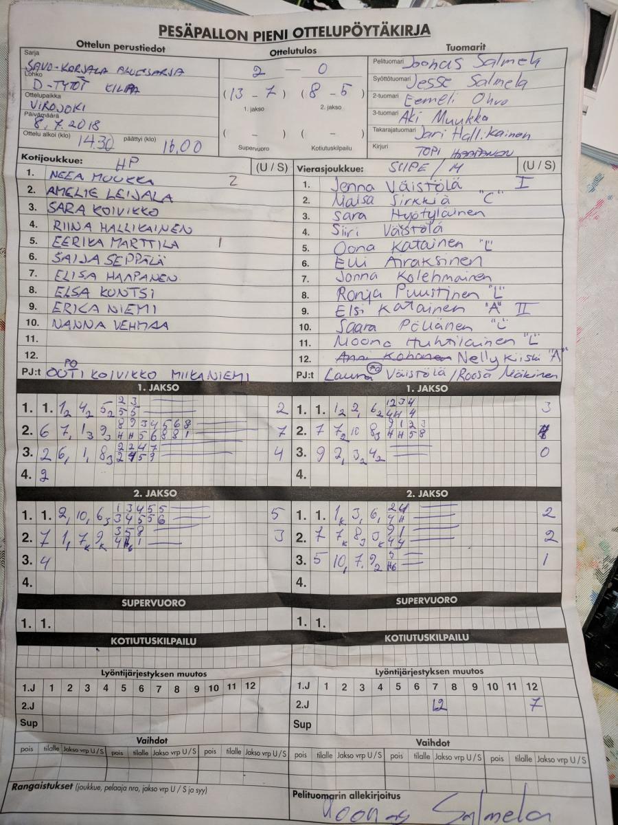 | 553214 | 27.6.2018 00:00 | Siilinjärvi | SiiPe/m | SiiPe/k | 2-0 (8-3, 27-7) | näytä |