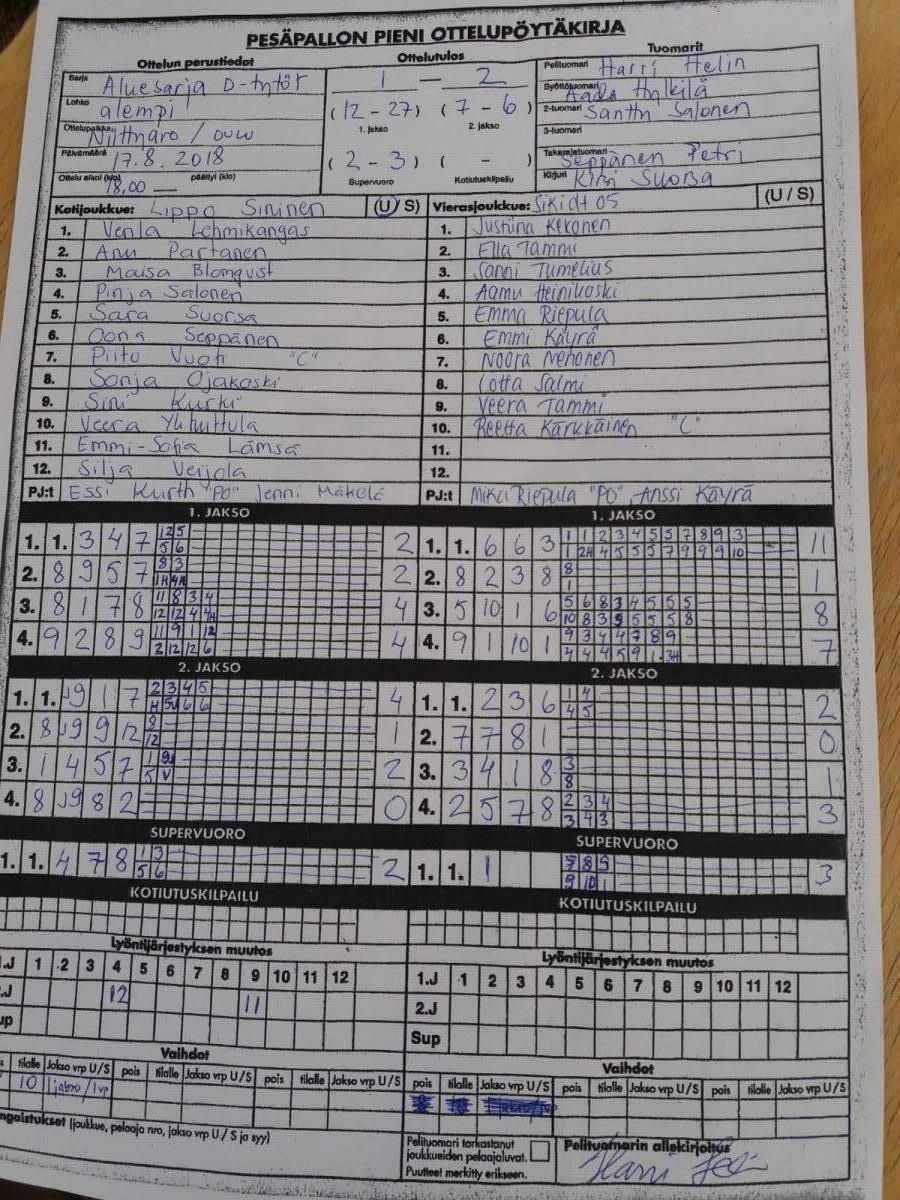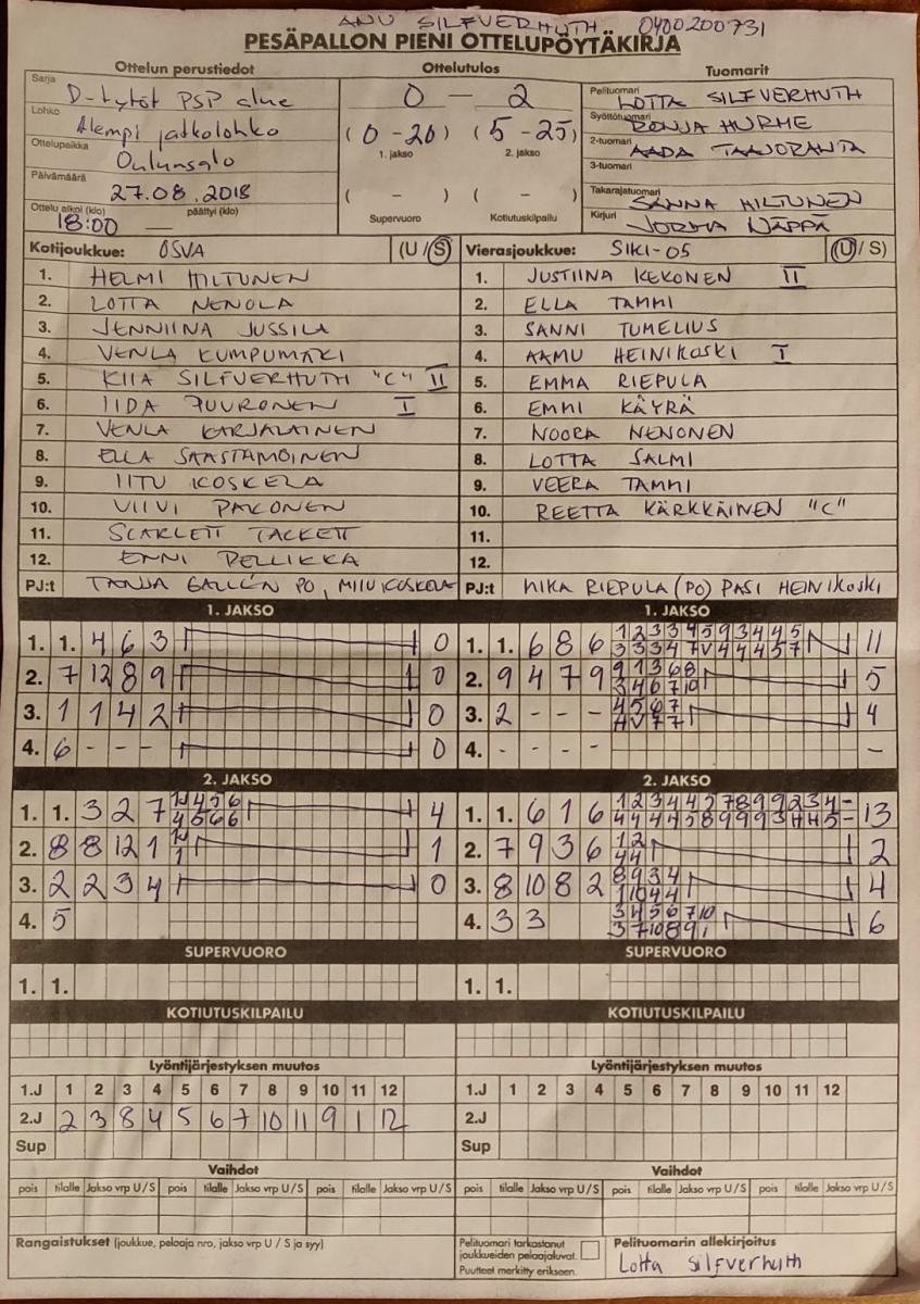 | 570475 | 17.8.2018 | Lippo Sininen | SiKi D-tytöt 05 | 1-2 (12-27, 7-6, 2-3) | näytä |
