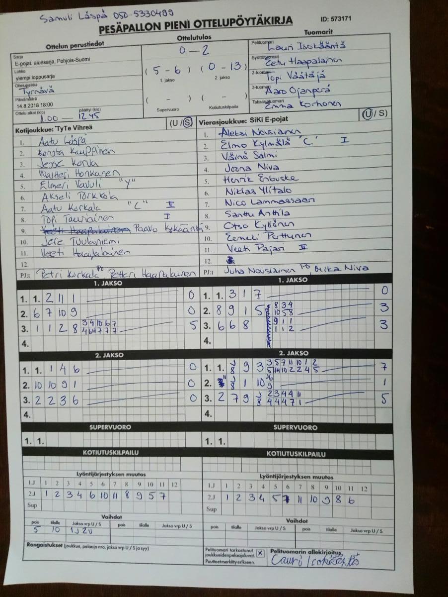 | 8. | TyTe Vihreä | 7 | 0 | 0 | 0 | 0 | 0 | 0 | 7 | 33 - 209 | 0 |