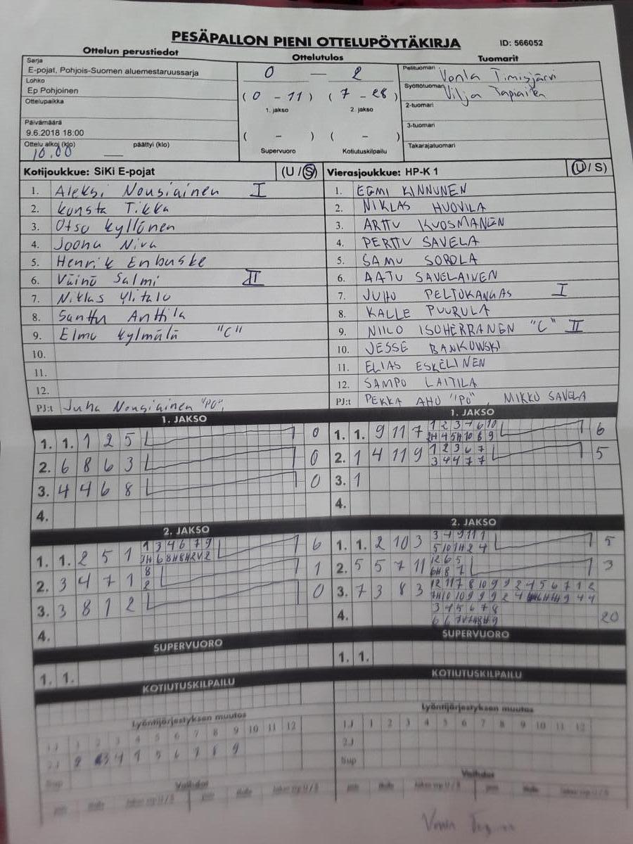| 566052 | 9.6.2018 | SiKi E-pojat | HP-K 1 | 0-2 (0-11, 7-27) | näytä |