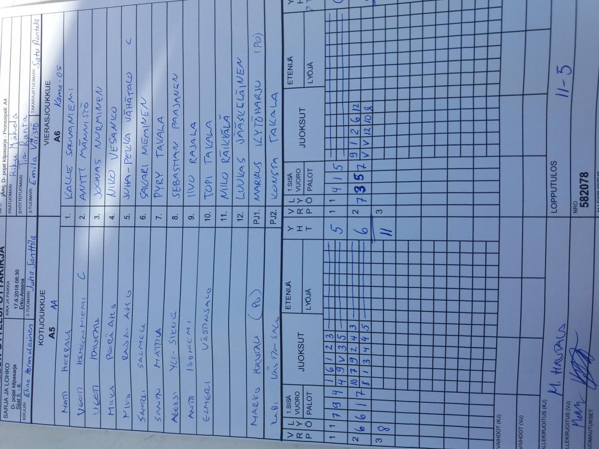 | 582078 | 17.6.2018 08:30 | Erku-Areena | AA D-pojat 04 | KaMa D-05 | 11-5 | D- pojat kilpasarja: SMJ -05 Musta | näytä |