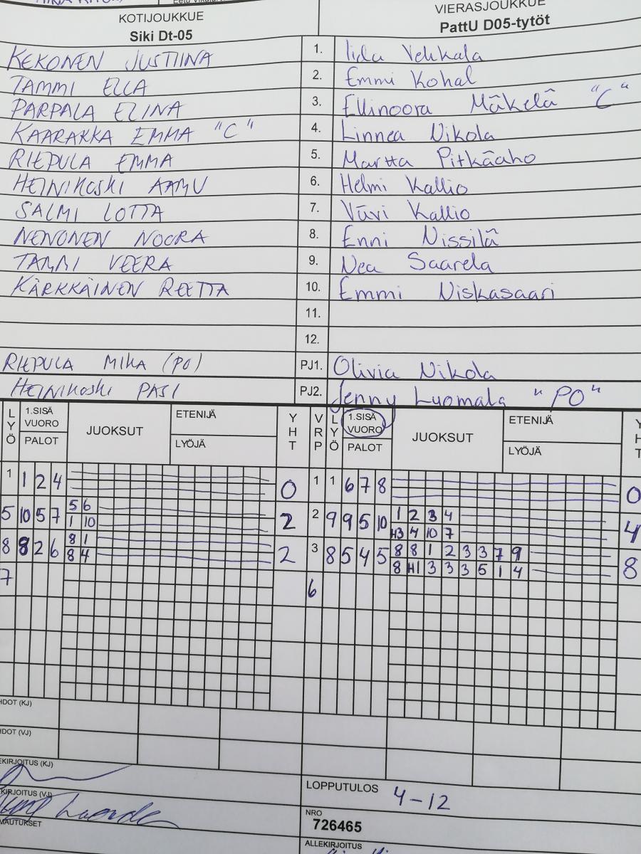 | 726122 | 16.7.2019 09:30 | T11 Lintula1, Parkkipaikka | Siki Dt-05 | Siipe Mustat | 19-4 | D-tytöt kilpasarja: Fera D1 | näytä |