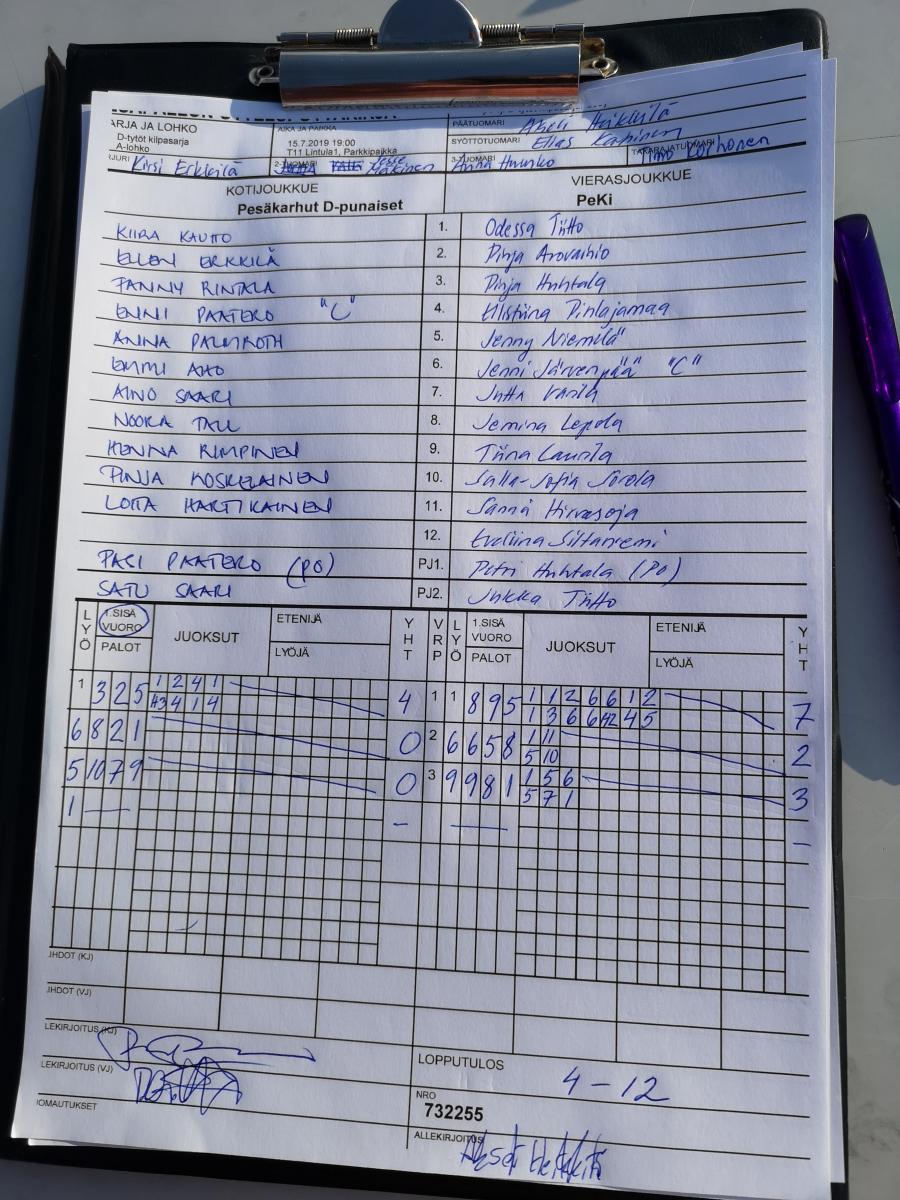 | 731939 | 17.7.2019 14:00 | T11 Lintula1, Parkkipaikka | VM oranssi | Pesäkarhut D-punaiset | 12-7 | D-tytöt kilpasarja: Mailajuniorit | näytä |