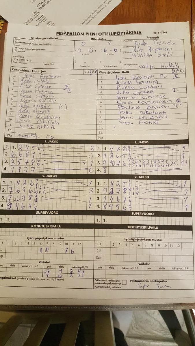 | 673440 | 13.8.2019 | Lippo jun | KeKi | 0-1 (3-13, 6-6) | näytä |