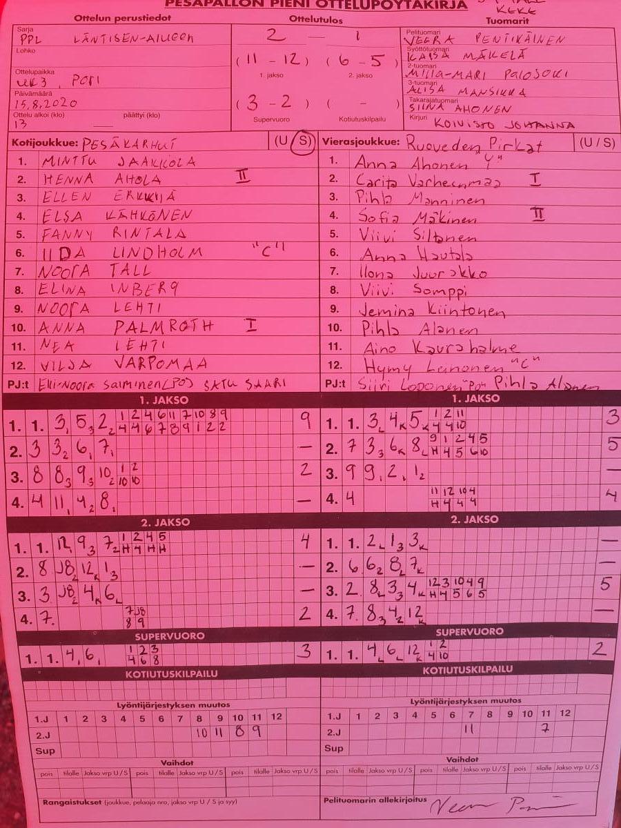 | 777841 | 2.8.2020 15:00* | Mailattaret | Pesäkarhut C-Mustat | 1-2 (13-8, 3-19, 0-1) | näytä |