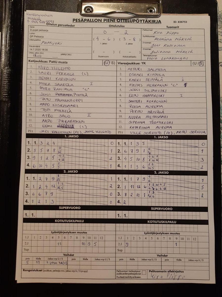| 836753 | 14.7.2020 | PattU musta | YK | 0-2 (4-6, 3-8) | näytä |