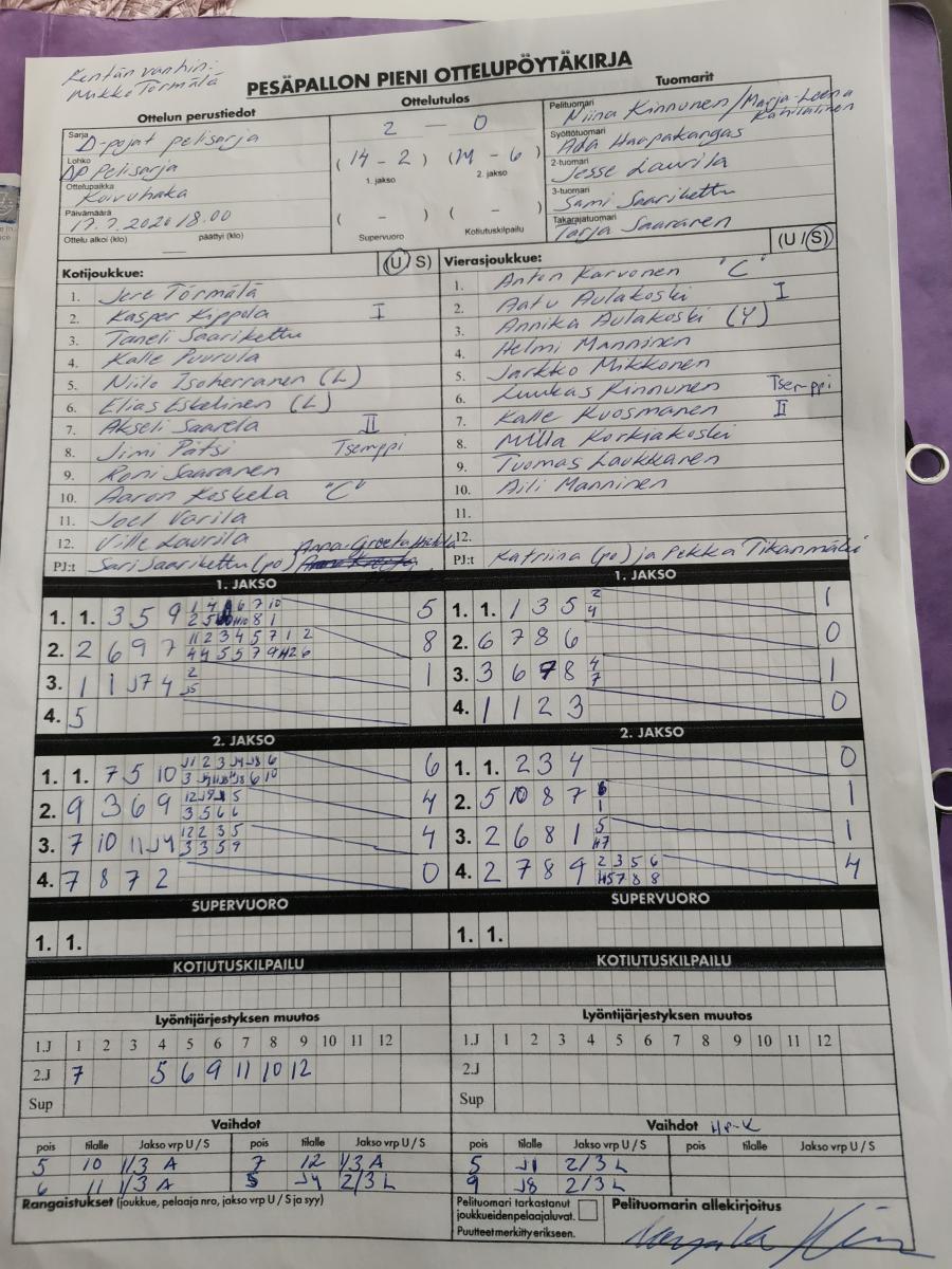 | 835709 | 8.8.2020 | YK | Veteli | 1-2 (4-18, 13-5, 0-0, 2-4) | näytä |