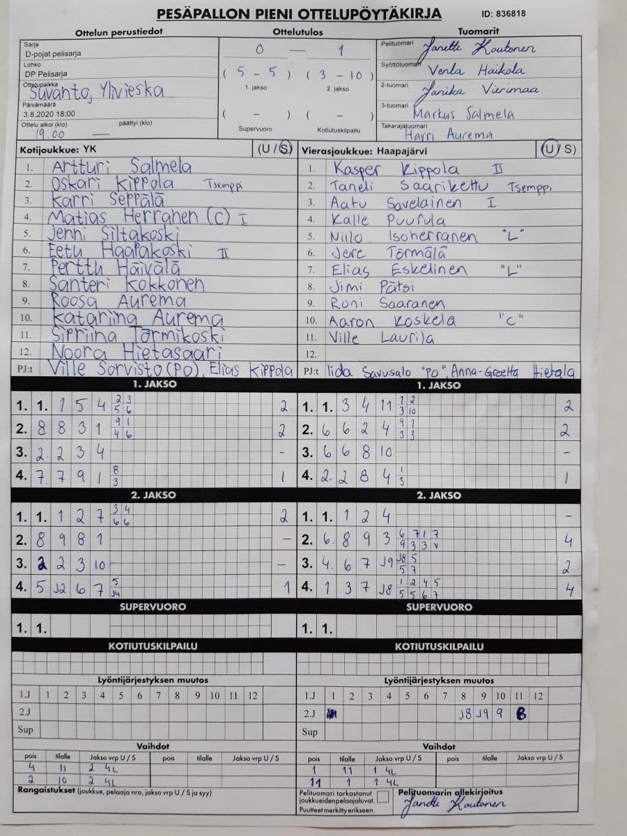 | 836818 | 3.8.2020 | YK | Haapajärvi | 0-1 (5-5, 3-10) | näytä |