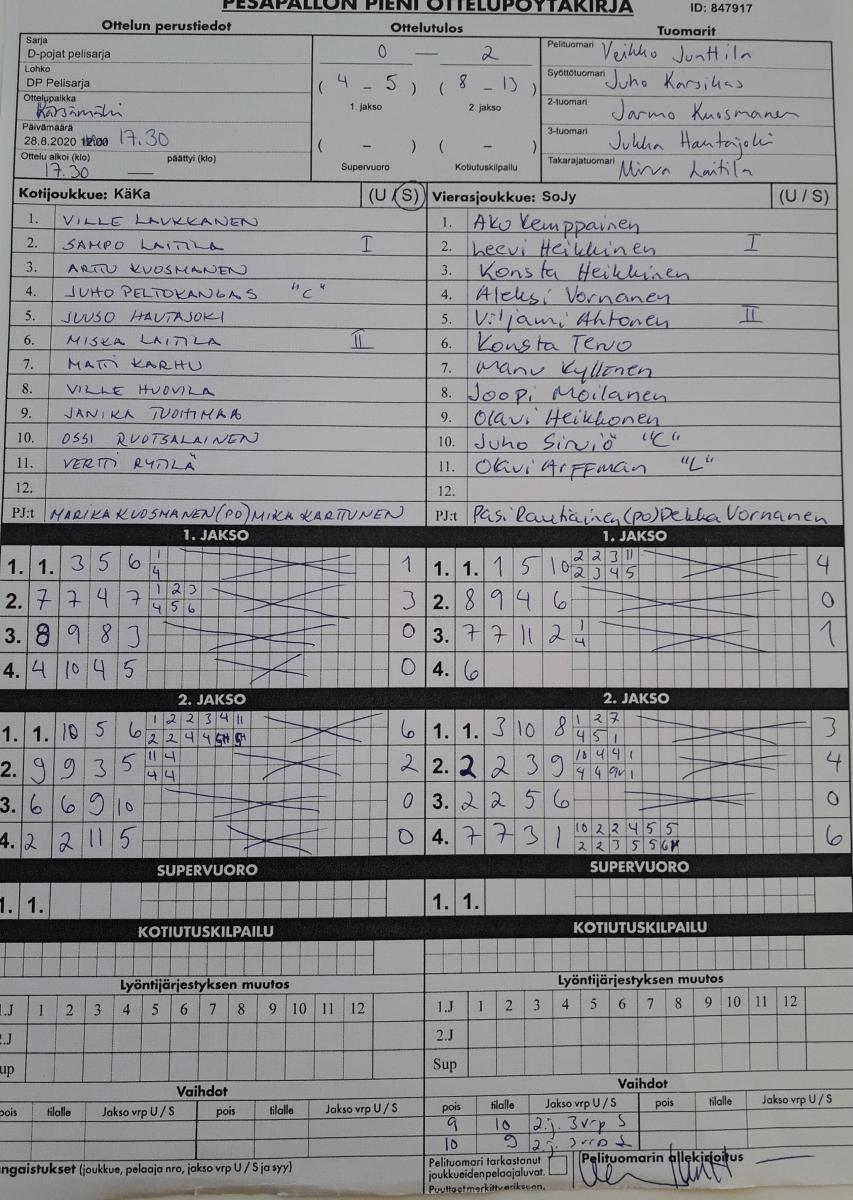 | 847917 | 28.8.2020 | KäKa | SoJy | 0-2 (4-5, 8-13) | näytä |