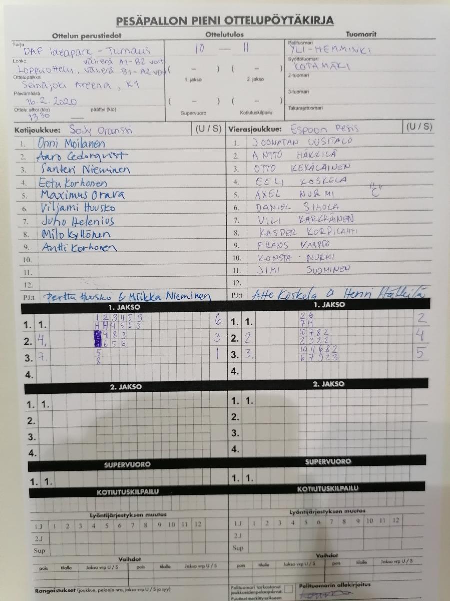 | 775050 | 16.2.2020 13:30 | Sojy Oranssi | Espoon Pesis | 10-11 | näytä |