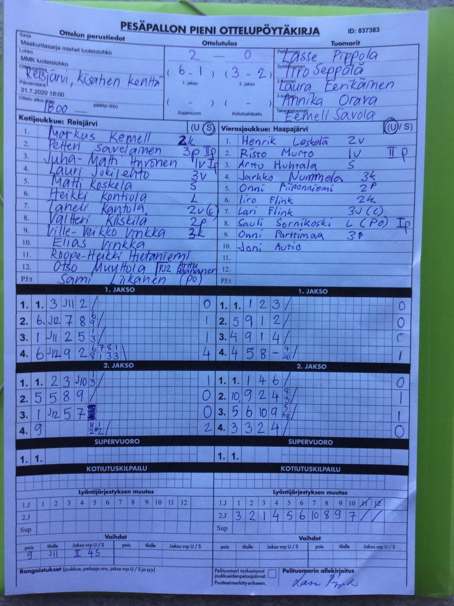 | 837406 | 28.7.2020 | Reisjärvi | NiPe | 1-0 (9-6, 3-3) | näytä |