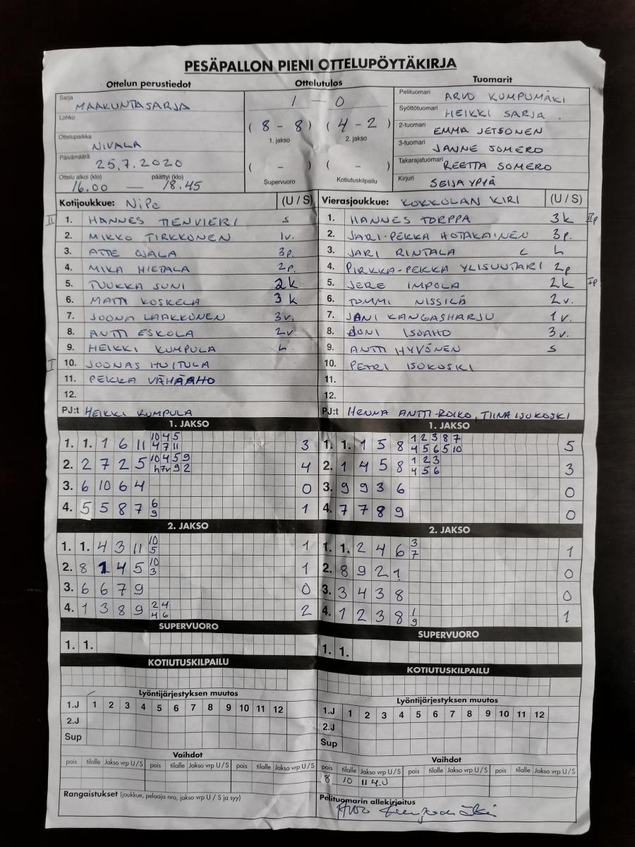 | 837422 | 25.7.2020 | NiPe | Kokkola | 1-0 (8-8, 4-2) | näytä |