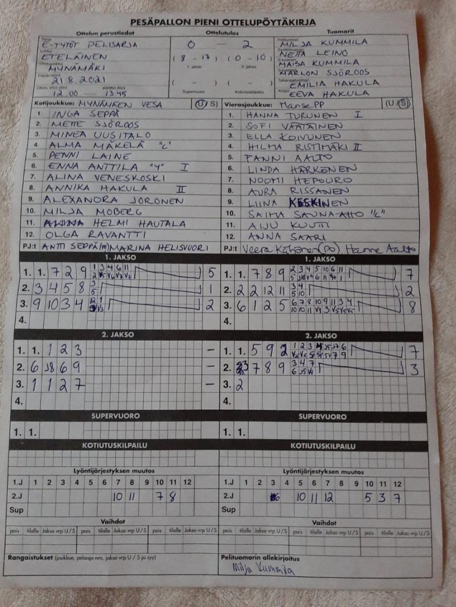 | 902755 | 21.8.2021 11:00* | Manse PP ET | MyVe ET | 2-0 (17-8, 10-0) | näytä |