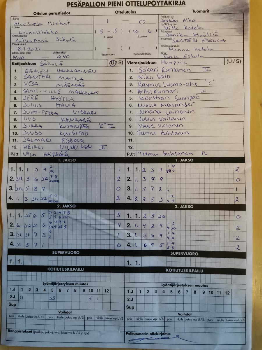 | 925693 | 3.9.2021 00:00* | Hukka-Ukot | HuVe 2 | 1-2 (7-4, 6-9, 2-2, 2-3) | näytä |