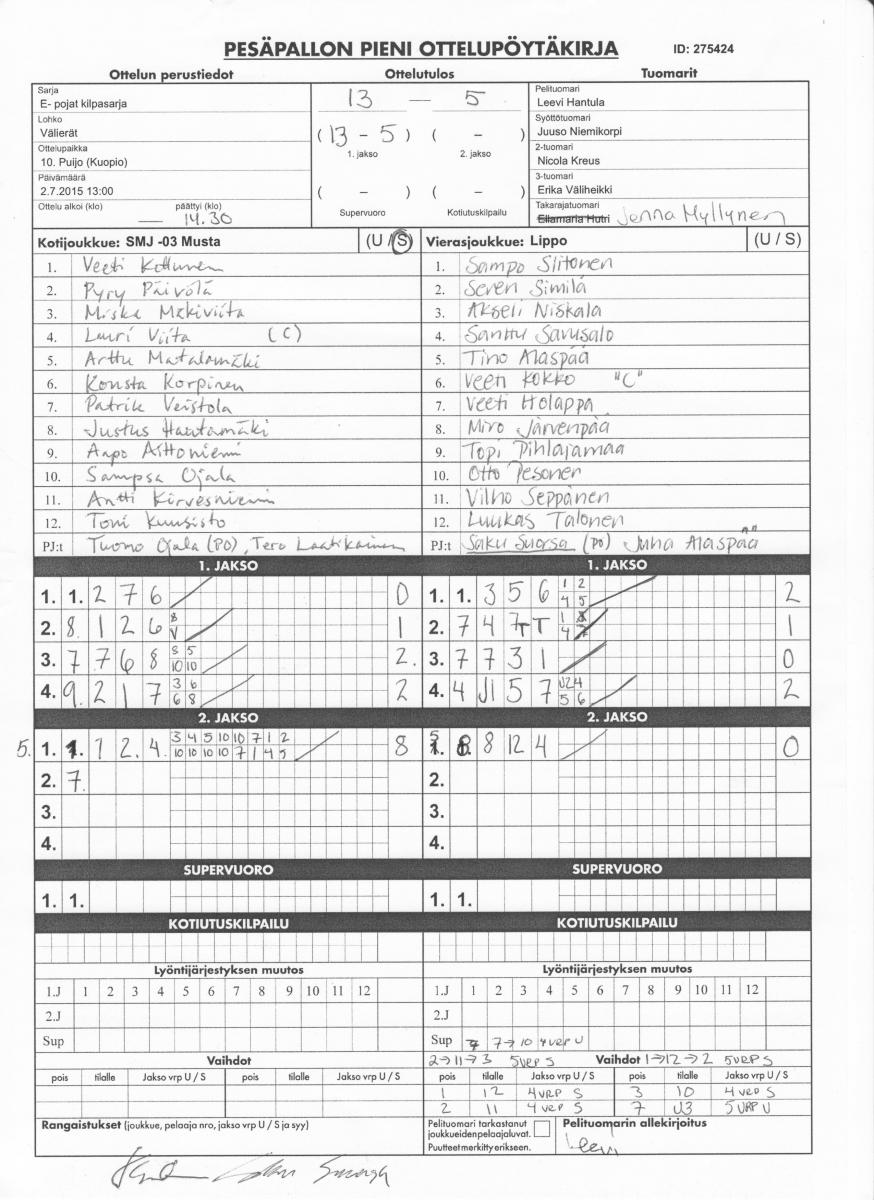 | 275424 | 2.7.2015 13:00 | 10. Puijo (Kuopio) | SMJ -03 Musta | Lippo | 13-5 | näytä |