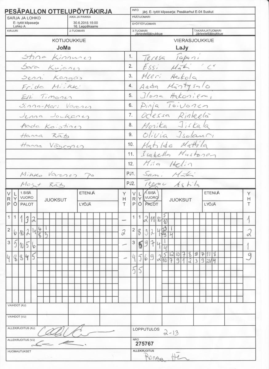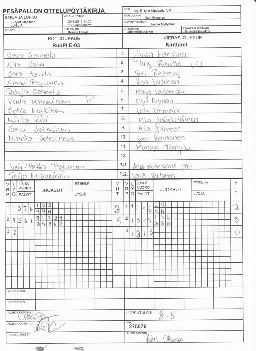 | # | Joukkue | O | V | T | H | JUOKSUT | P |