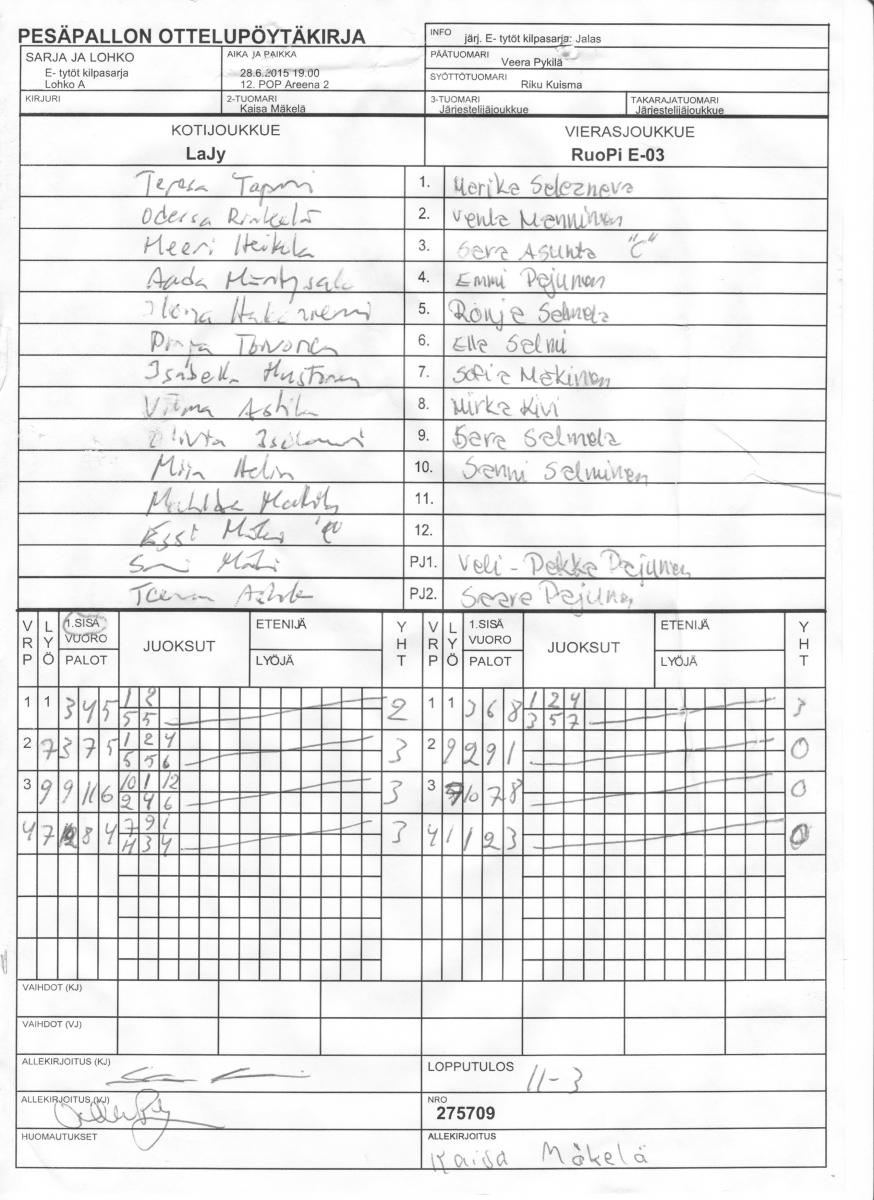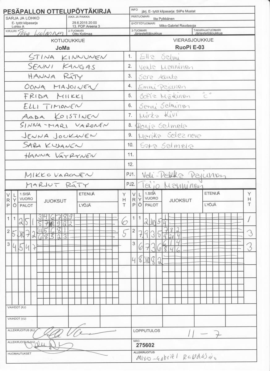 | 6. | Pesäkarhut E-04 Suskut | 7 | 2 | 0 | 5 | 37 - 73 | 4 |