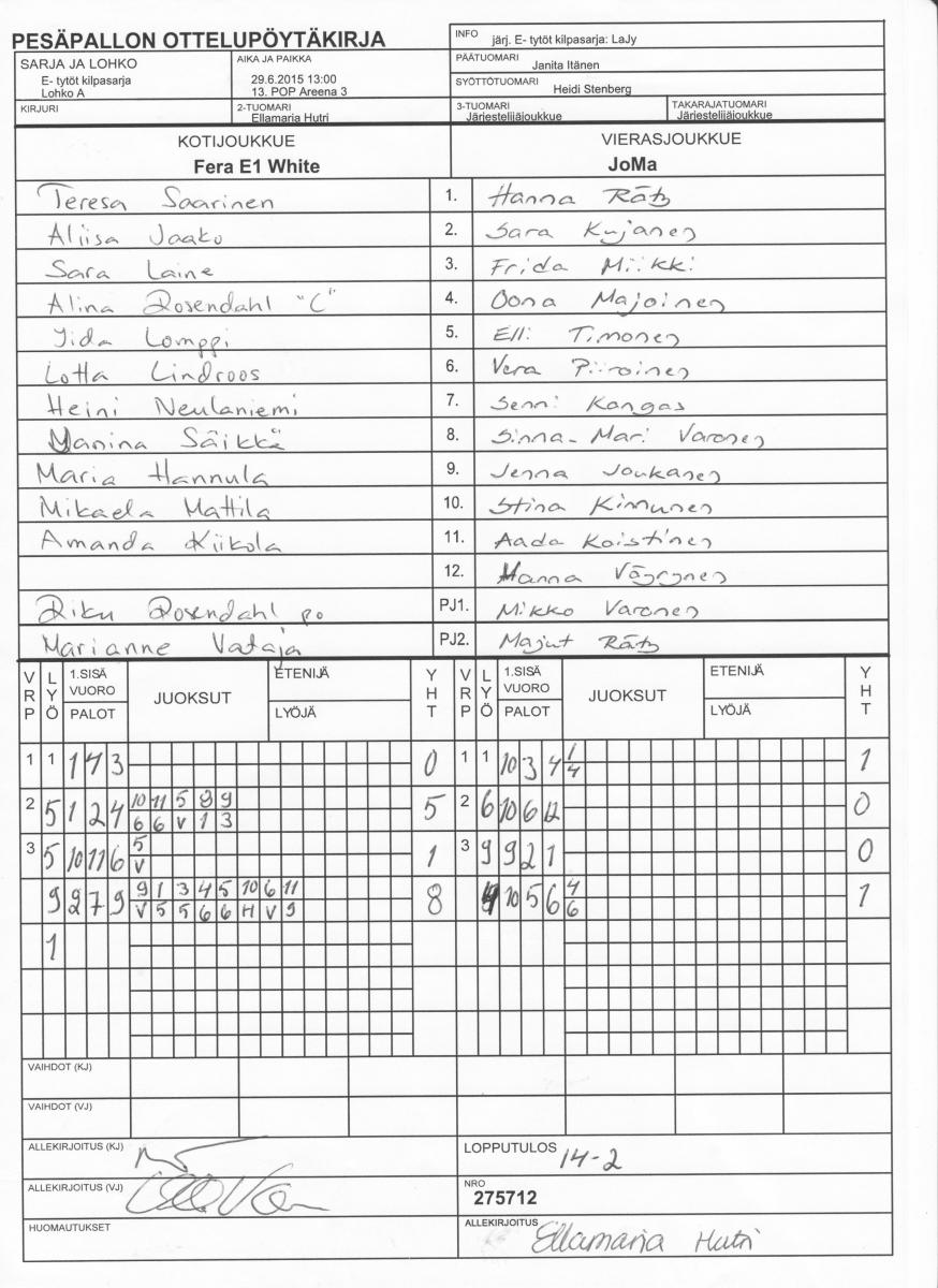 | 1. | Fera E1 White | 7 | 7 | 0 | 0 | 112 - 13 | 14 |