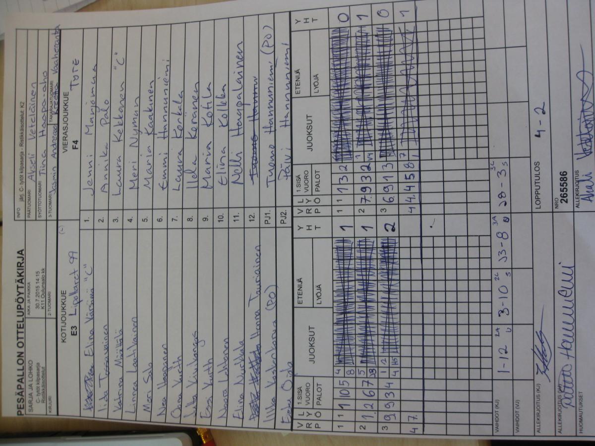| 265667 | 30.7.2015 13:00 | K13 Lintula | HP | HP-K | 9-6 | C- tytöt kilpasarja: Räpsä C-tytöt | näytä |