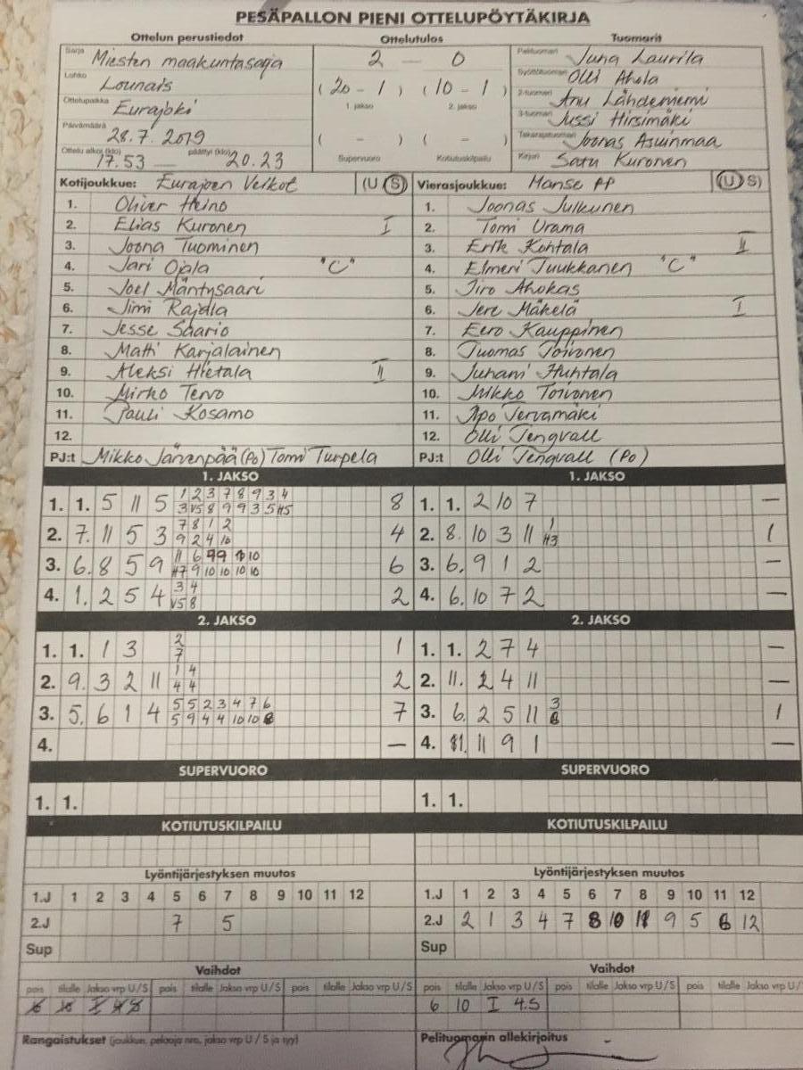 | 28.7.2019 18:00 | Eurajoen Veikot | Manse PP | 2-0 (20-1, 10-1) | näytä | |