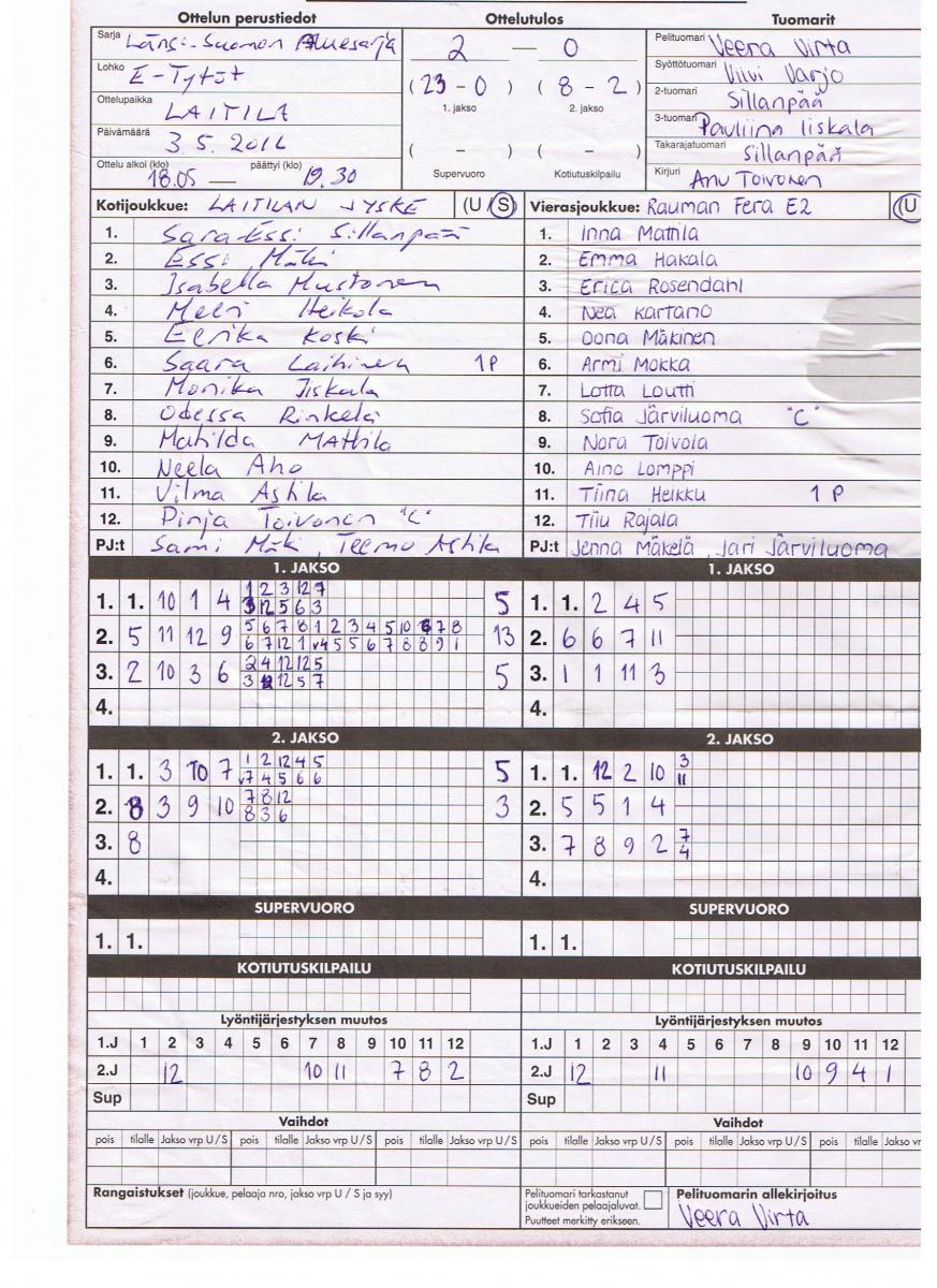 | 17.5.2016 18:00 | Fera E2 | MJ E-tytöt | 0-2 (0-5, 3-14) | näytä | |