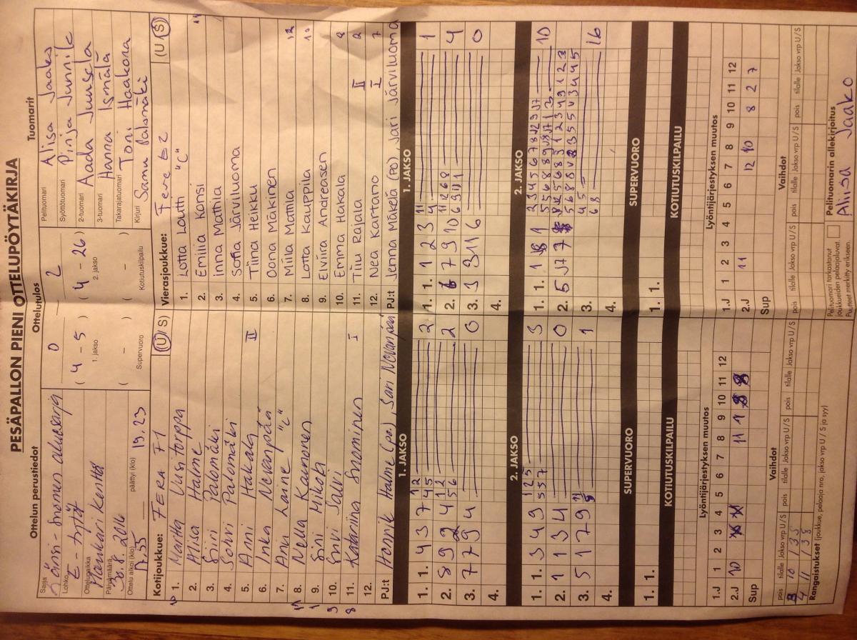 | 6.9.2016 18:00 | Pesäkarhut F06 | Fera E2 | 0-2 (4-18, 2-22) |