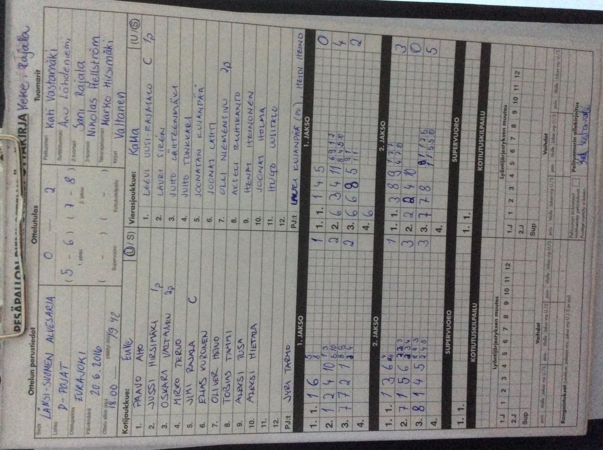 | 1.8.2016 18:00 | PomPy D-pojat | EuVe | 1-0 (4-4, 6-3) | ||