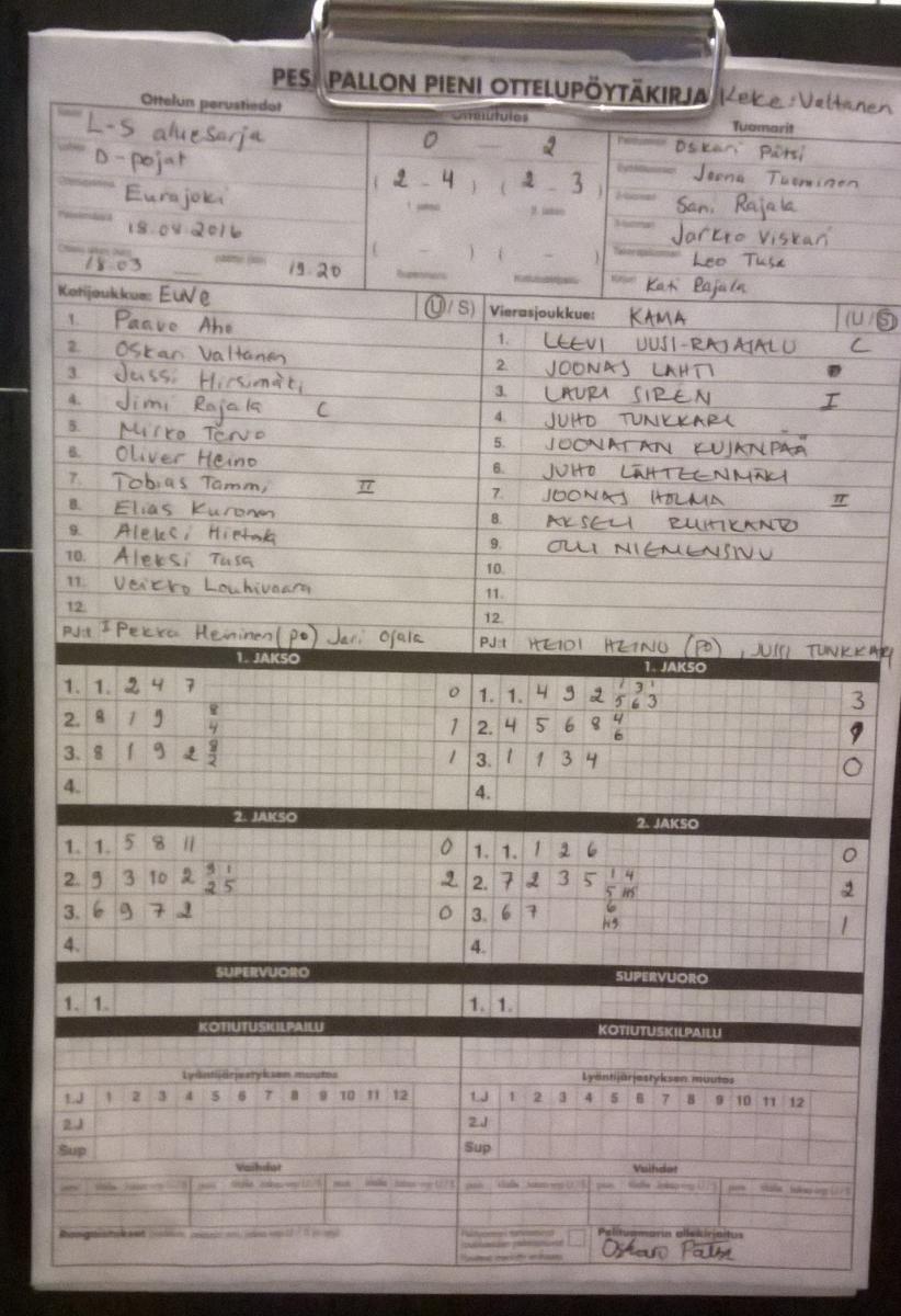 | 11.5.2016 18:00 | UP-V D- pojat | EuVe | 1-2 (10-6, 0-12, 1-2) | ||