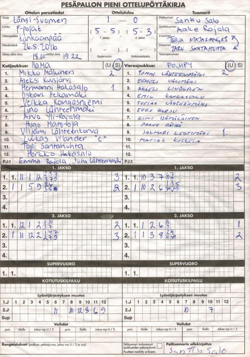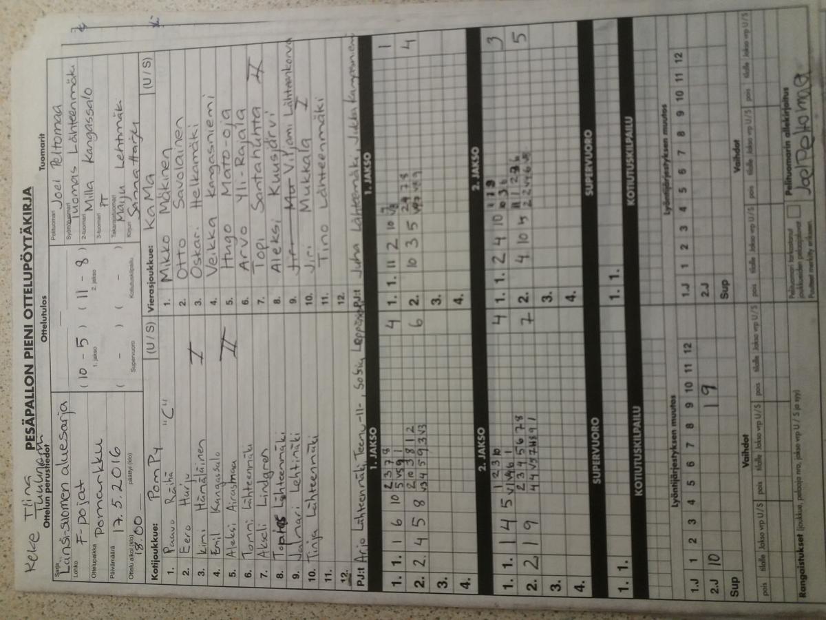 | 17.5.2016 18:00 | PomPy F-pojat | KaMa 06 F-pojat | 2-0 (10-5, 11-8) | näytä | |